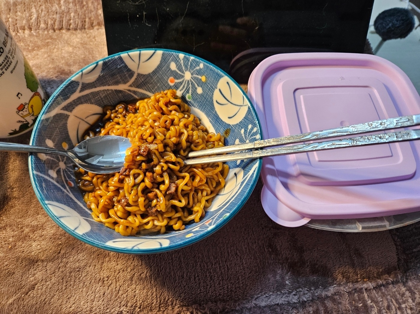 배가 고파질 때쯤, 저는 3분 짜장이나 햇반 같은 걸 전자레인지에 돌려요.